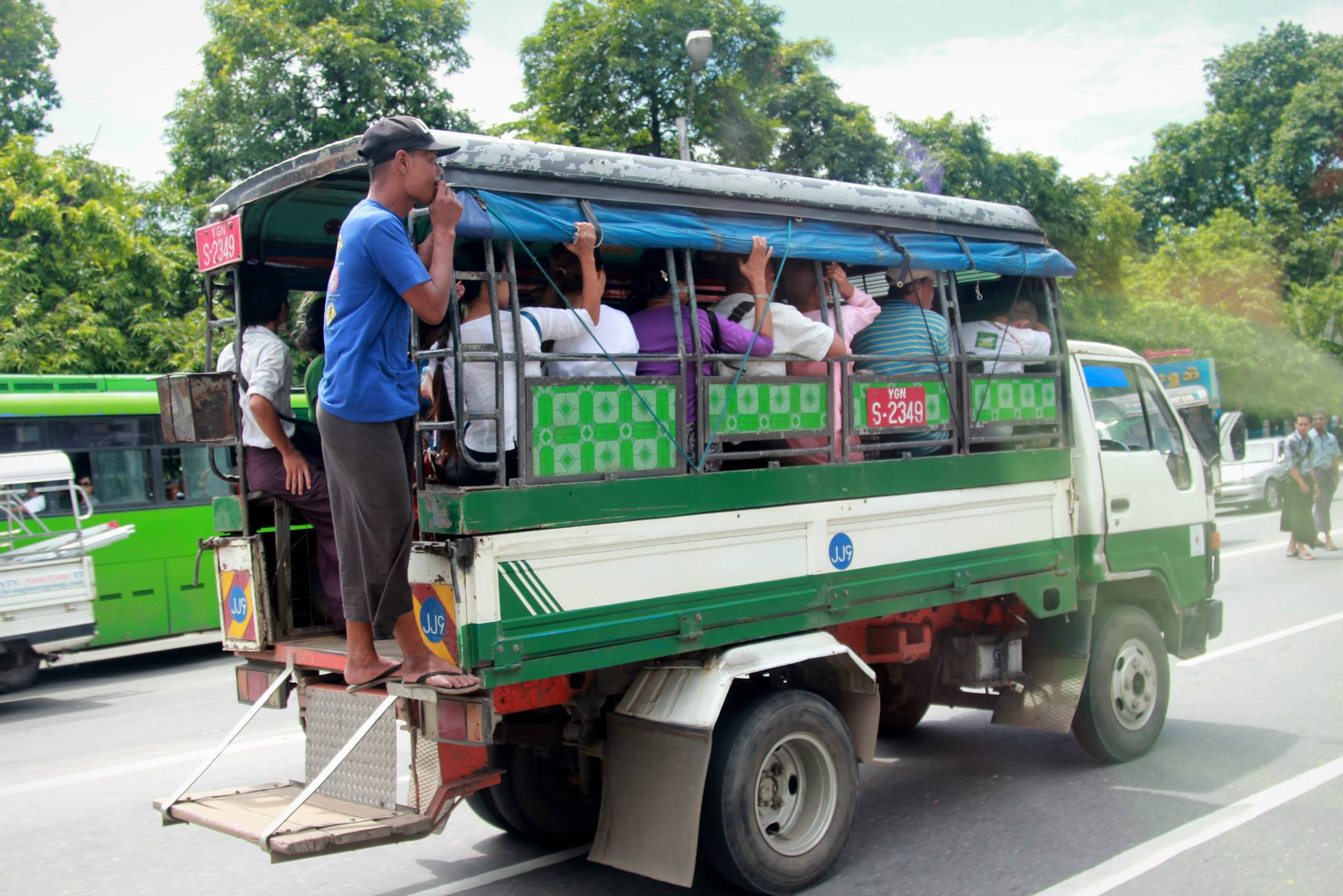 在緬甸時,有一種交通工具特別吸引我的目光——載滿人的「貨車」。這些車大多是小型卡車或皮卡車(pickup truck),車斗後面簡單加裝鐵架與棚子,就成了當地最普遍的交通工具之一。車上常常擠滿了人,有的坐、有的站,甚至還有人半吊在車尾踏板上,彷彿是緬甸街頭移動的風景畫。