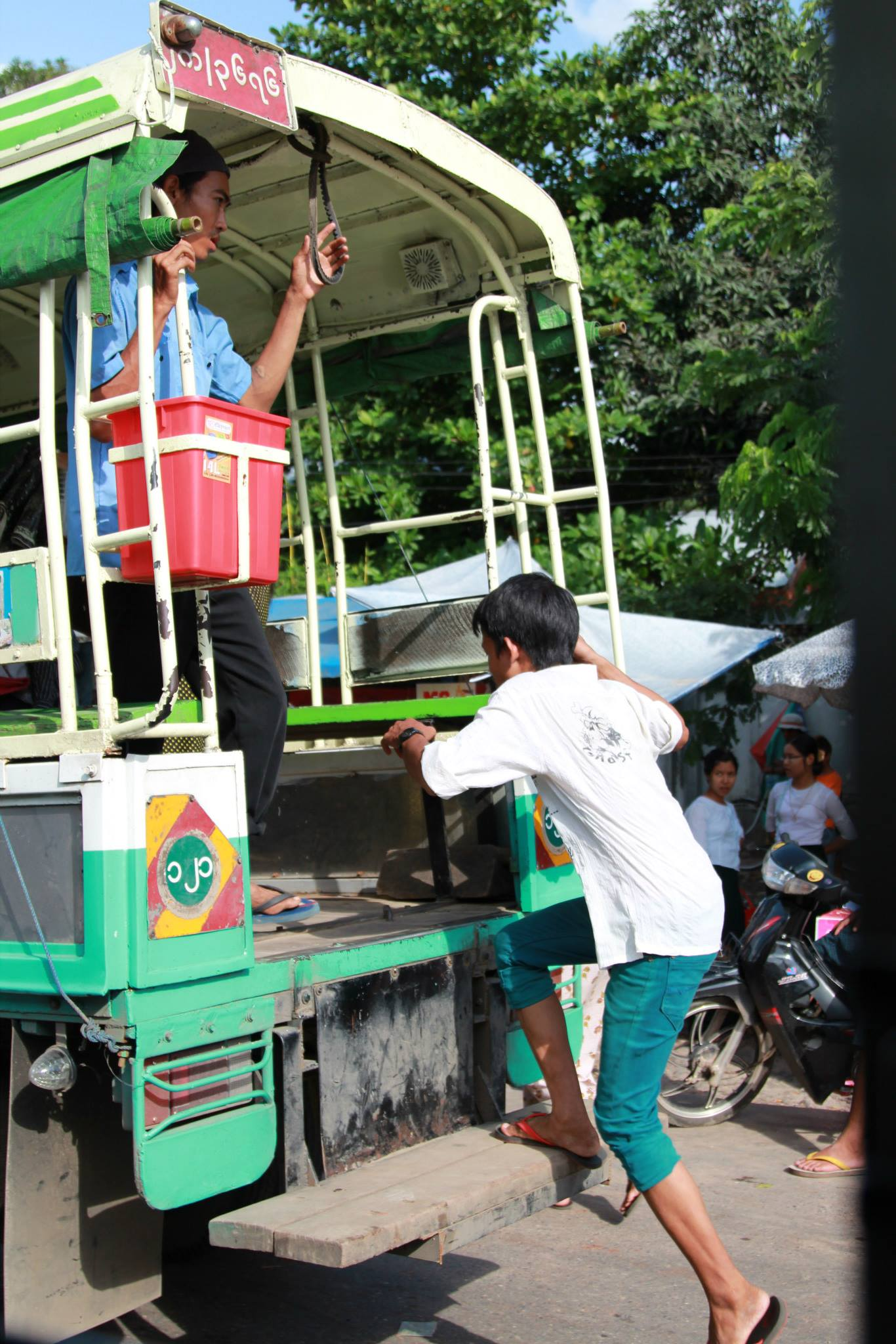 這樣的載人貨卡在緬甸的出現,最早可以追溯到軍政府時期,當時公共運輸系統資源稀缺,許多民眾買不起私家車,政府也無力提供足夠的公車服務,於是民間便開始用改裝卡車來「順路載人」,慢慢演變成一種平民交通工具。直到今天,即使計程車與摩托車普及,這種「搭便車式」的交通方式仍然非常盛行,尤其在像臘戌、曼德勒這樣的城市或周邊城鎮。它的票價通常比正式巴士便宜許多,因此深受學生、勞工與家庭主婦的歡迎。車上沒有固定座位,也沒有時刻表,但只要伸手一攔,大多都願意停下來載人。