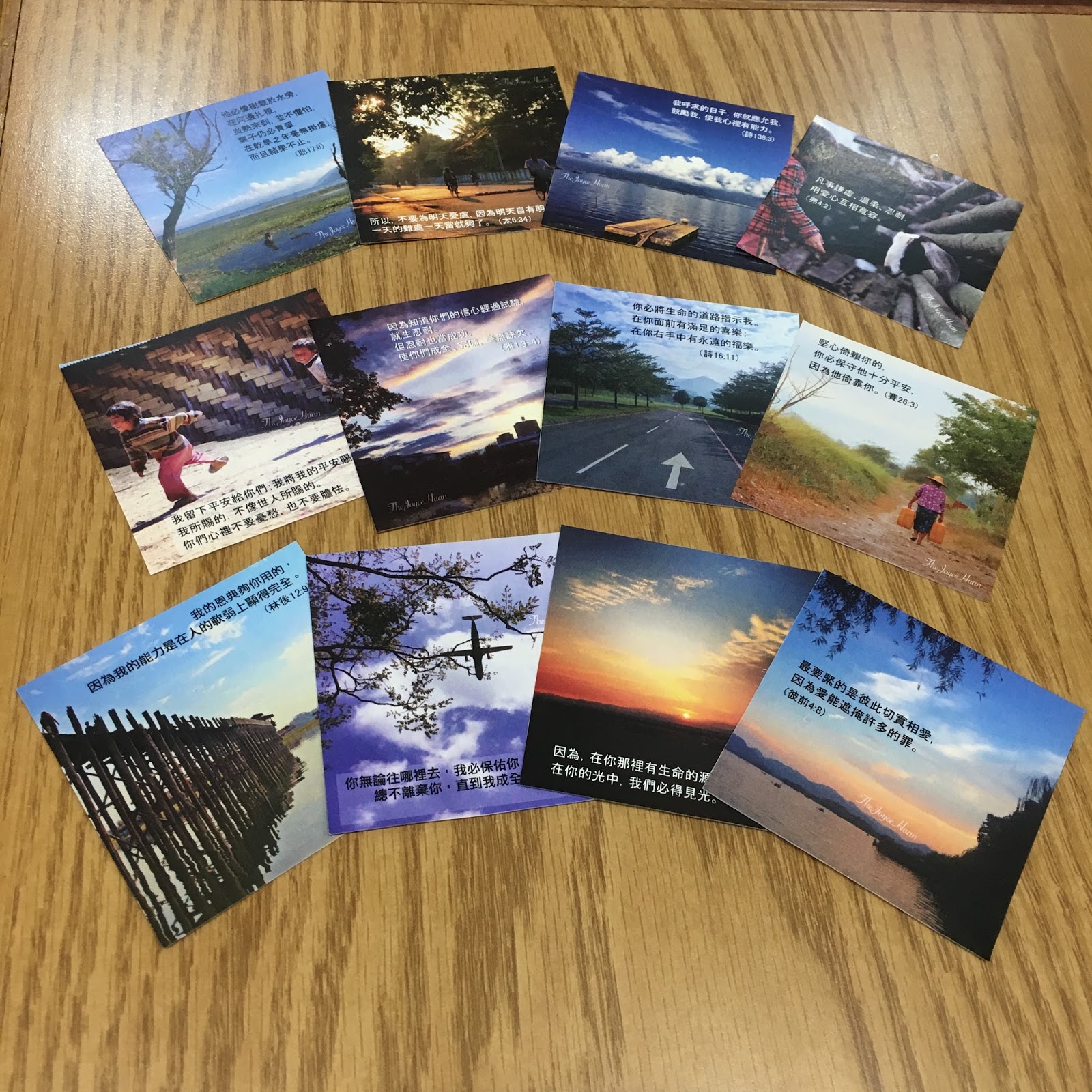 我設計的經文卡,總共有12款,照片拍攝地點包含台灣、中國雲南、緬甸,