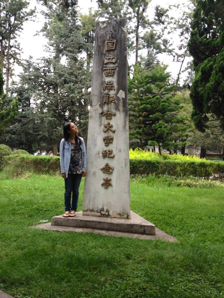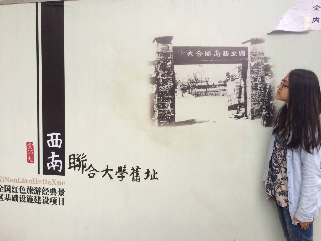 「西南聯大遺址」位於雲南師範大學校內。這次來的時候遺址大門在整修,全部圍起來,只能跟這面牆壁上的照片合影。雖然只能看到照片圖片,但是依舊可以感受到當時戰時的學校氛圍,戰爭中要繼續唸書真的很困難,深深覺得我們現在能夠念書很幸福!