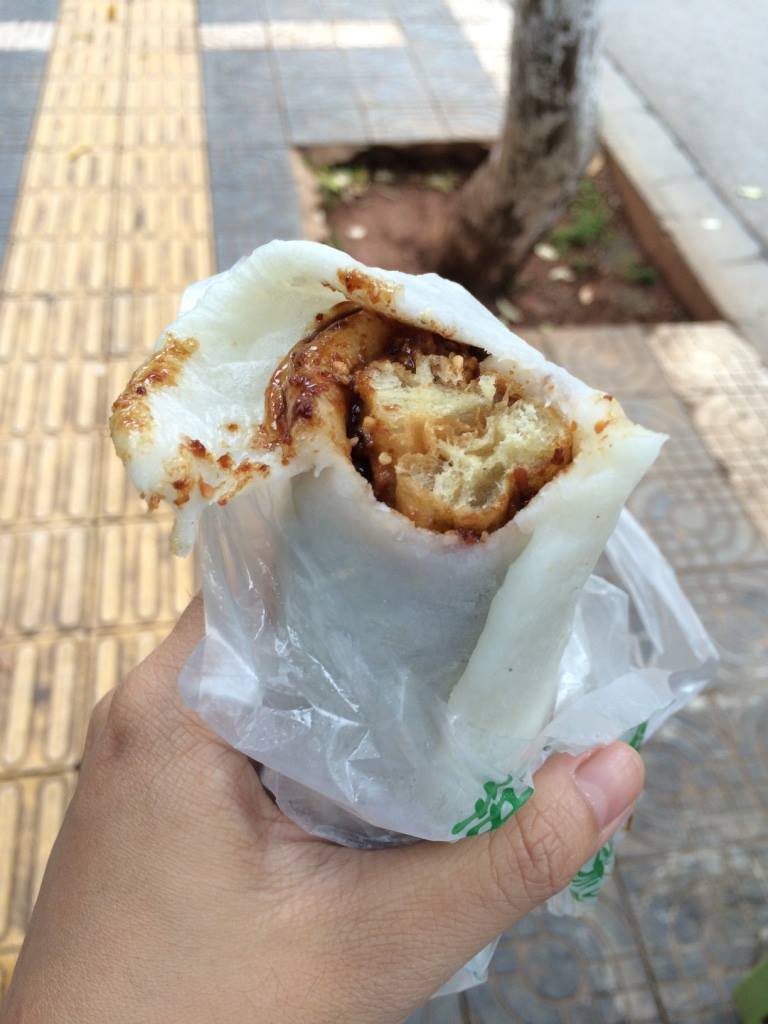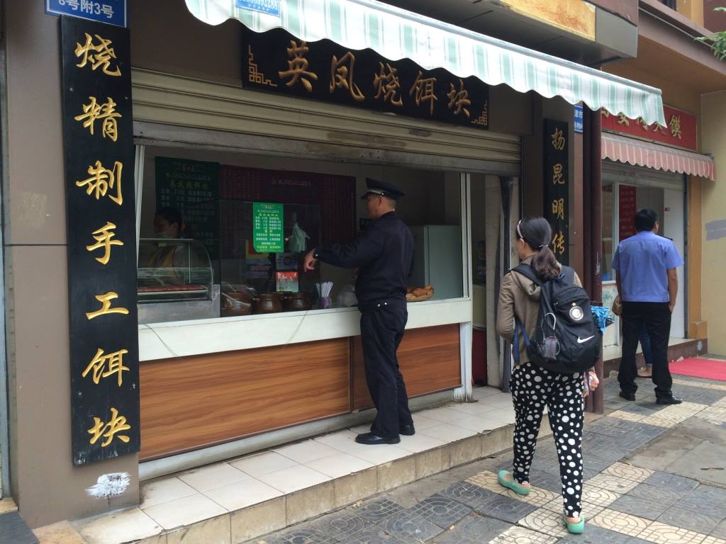 「燒餌塊」是雲南地區著名的特色小吃,用煮熟的大米飯壓成塊狀,通常是圓形薄餅狀。在炭火上面烤,然後塗上醬料和配菜。可根據個人口味加入不同的餡料,甜口味的燒餌塊常夾入紅糖、玫瑰糖、芝麻、花生碎等餡料,鹹口味則多加入土豆絲、火腿、豆腐乳、辣椒醬、油條等。我超愛燒餌塊,便宜好吃又能填飽肚子!