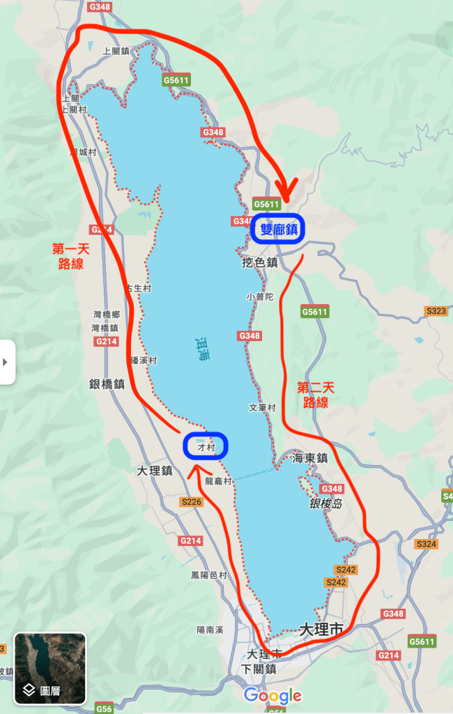 這次環洱海是走順時針路線,第一天從大理古城出發,目標是騎到雙廊鎮(整天路程約洱海全程三分之一長),在雙廊鎮住一晚。第二天從雙廊鎮出發,順時針環完剩下的三分之二,抵達才村。