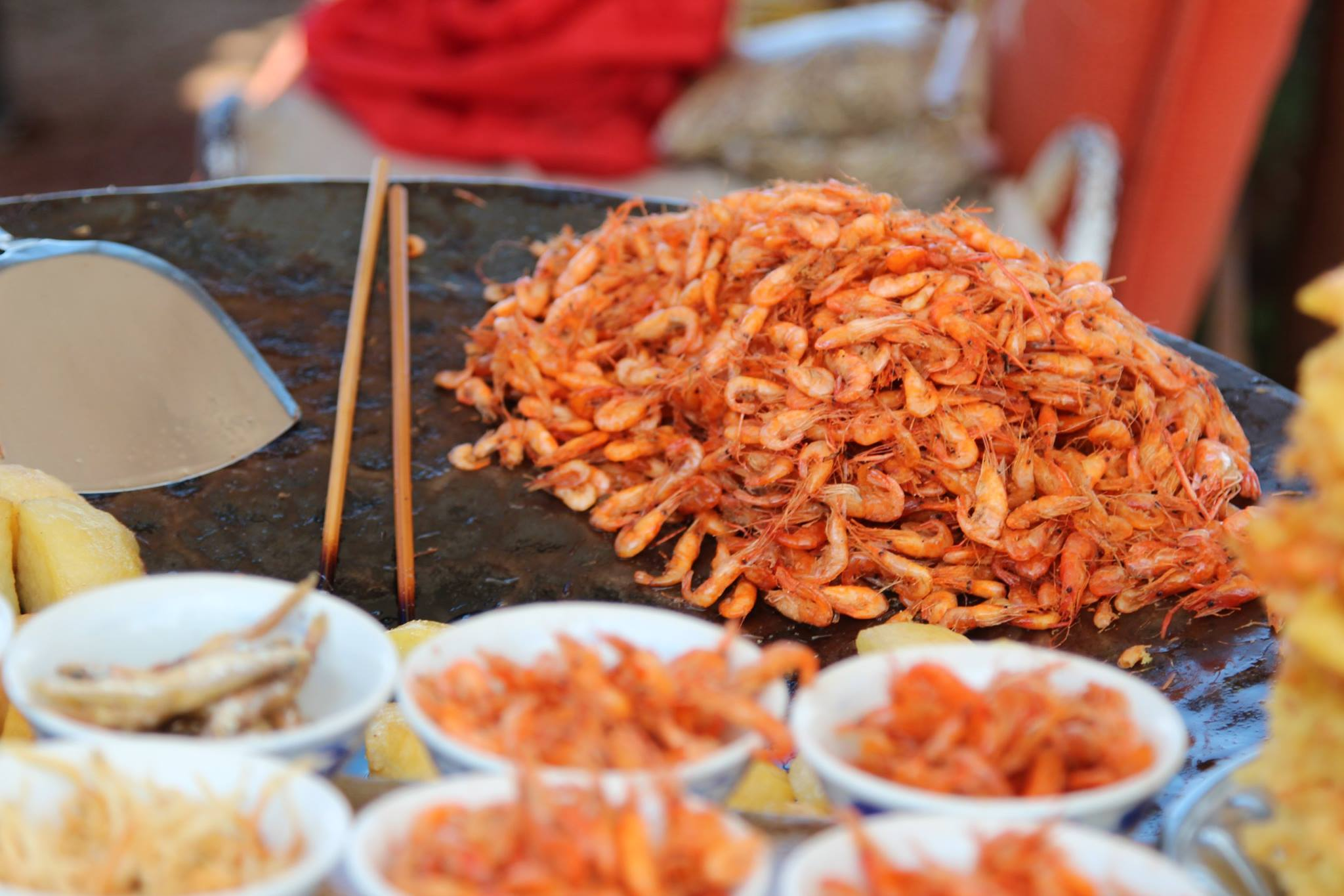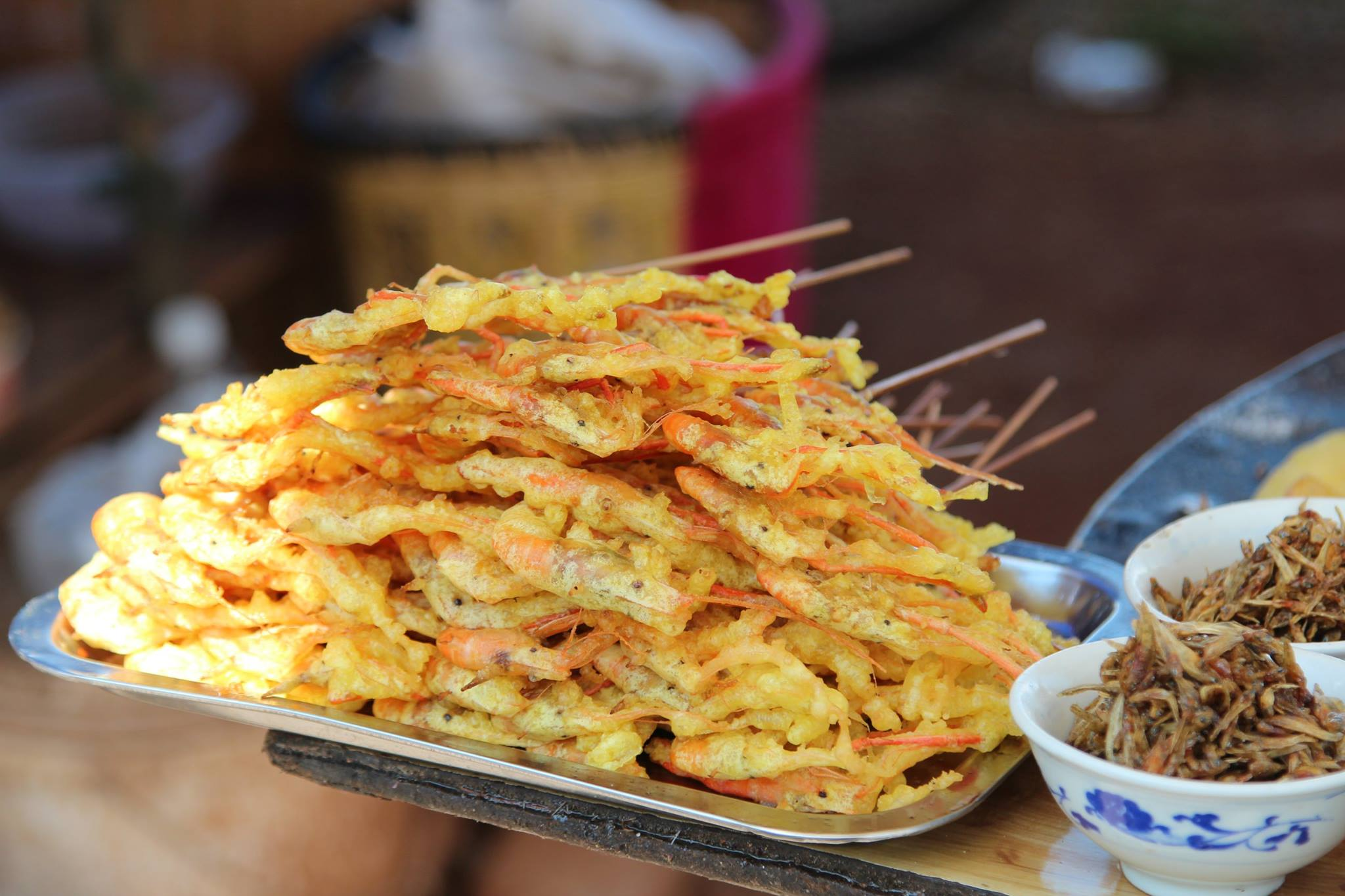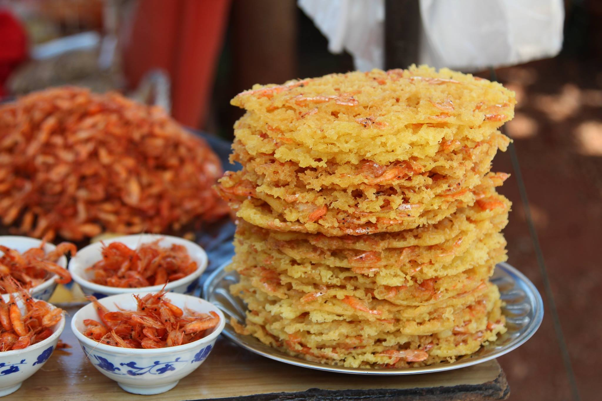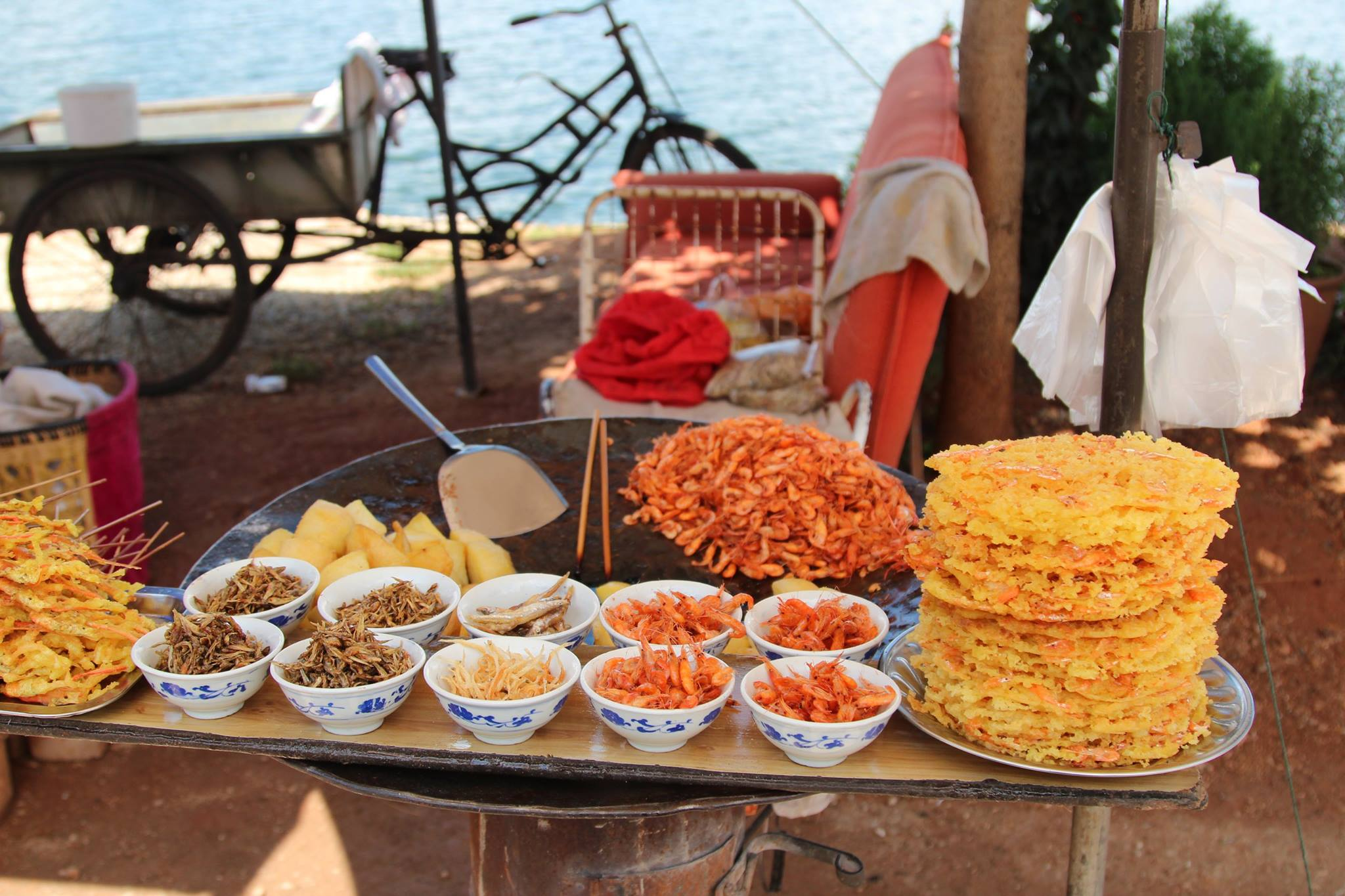騎車環洱海的過程,我在大理洱海附近的漁村街頭,有看到一些小攤販賣蝦餅(以前沒看過這種造型),蝦餅的外型像圓圓的薄餅,直徑大約手掌大小,炸得金黃酥脆。餅皮是用米漿製成,裡面放上洱海捕撈的小蝦或魚。老闆現場將米漿倒進平底鍋或熱油中,再把小蝦均勻撒在餅上,炸到外皮金黃酥脆。