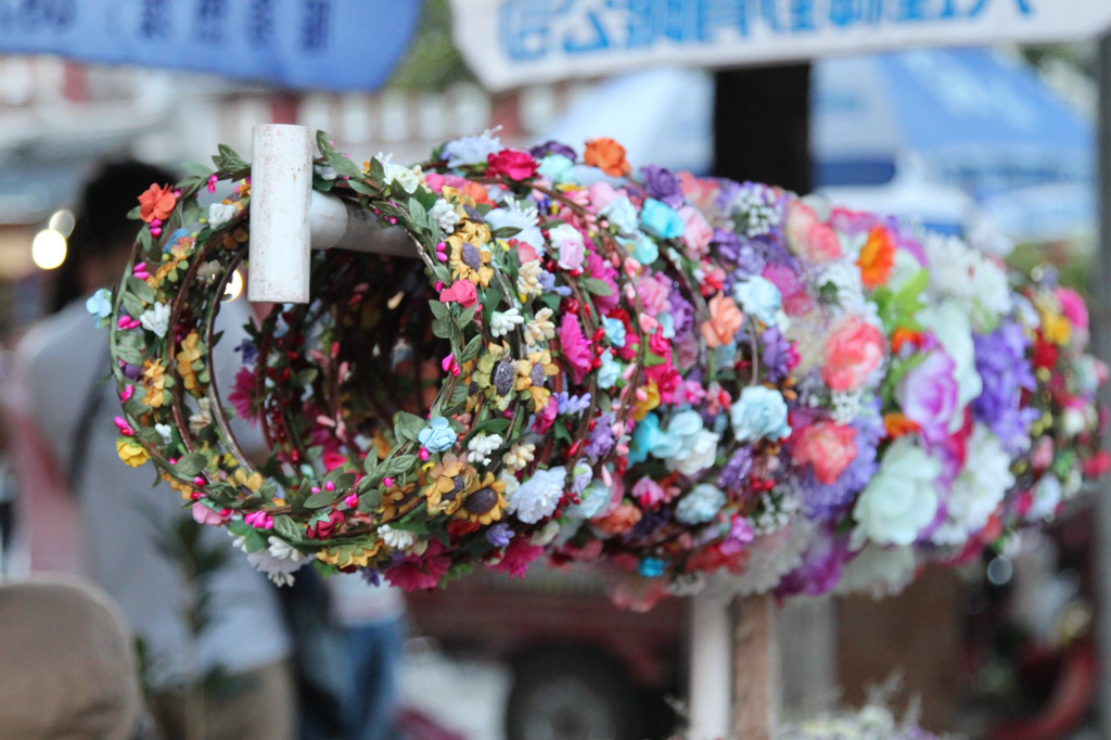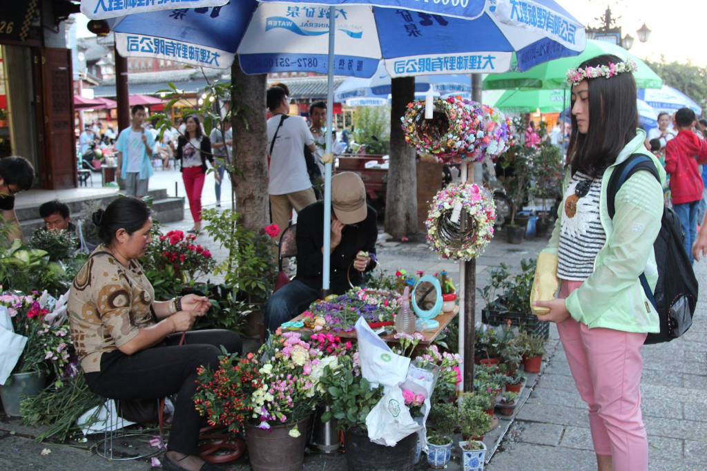 我跟朋友在大理古城裡隨意逛逛,發現有好多大媽在跳廣場舞,我朋友則是挑選了幾個花環戴在頭上(可能因為她很喜歡請別人幫她拍美照,所以需要購買足夠的拍照道具)。