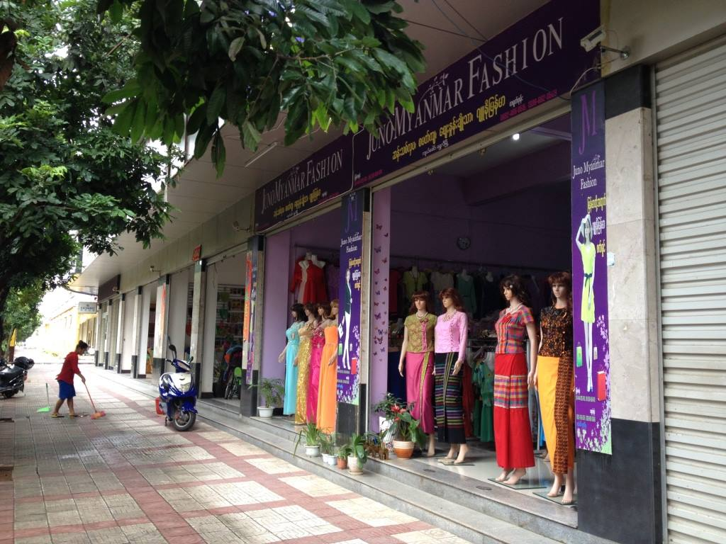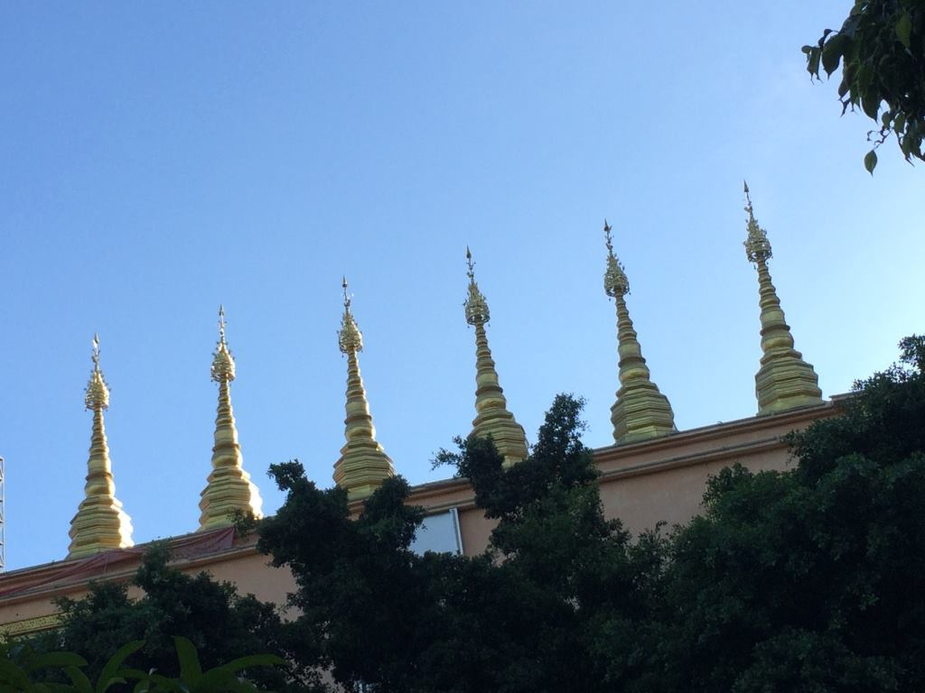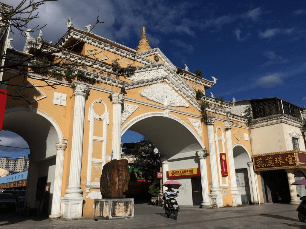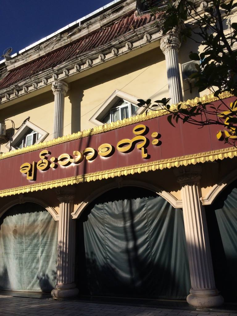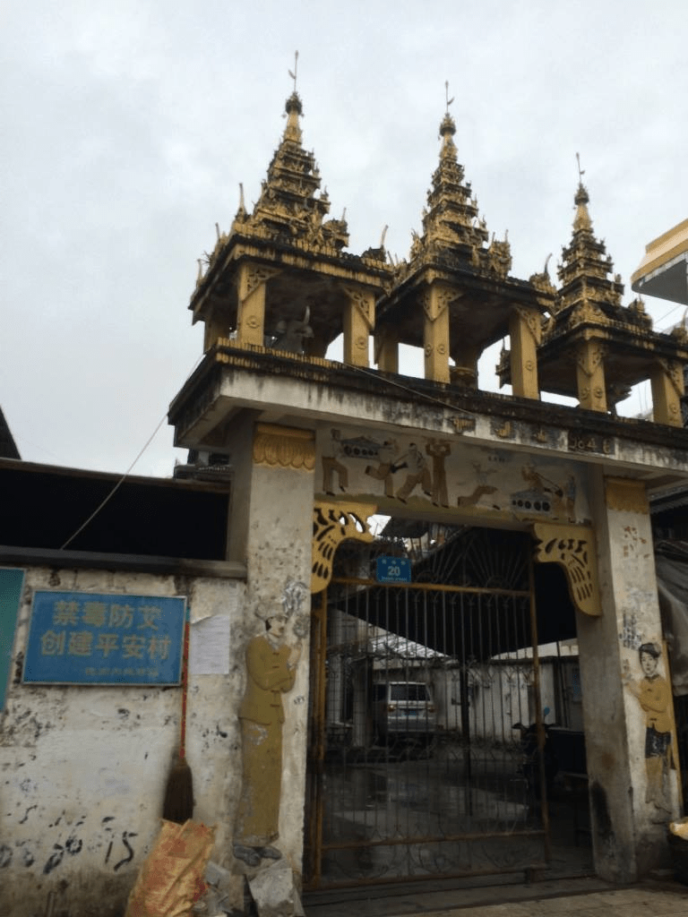 瑞麗的街上,可以看見到處都是穿著傳統傣族服飾的婦女,也有不少來瑞麗打工或工作的緬甸人,還有不少店面的牌子上寫著緬文,還有很多的珠寶店、玉石店。這裡的建築都挺有特色,金色、上頭有孔雀、造型有點像塔。