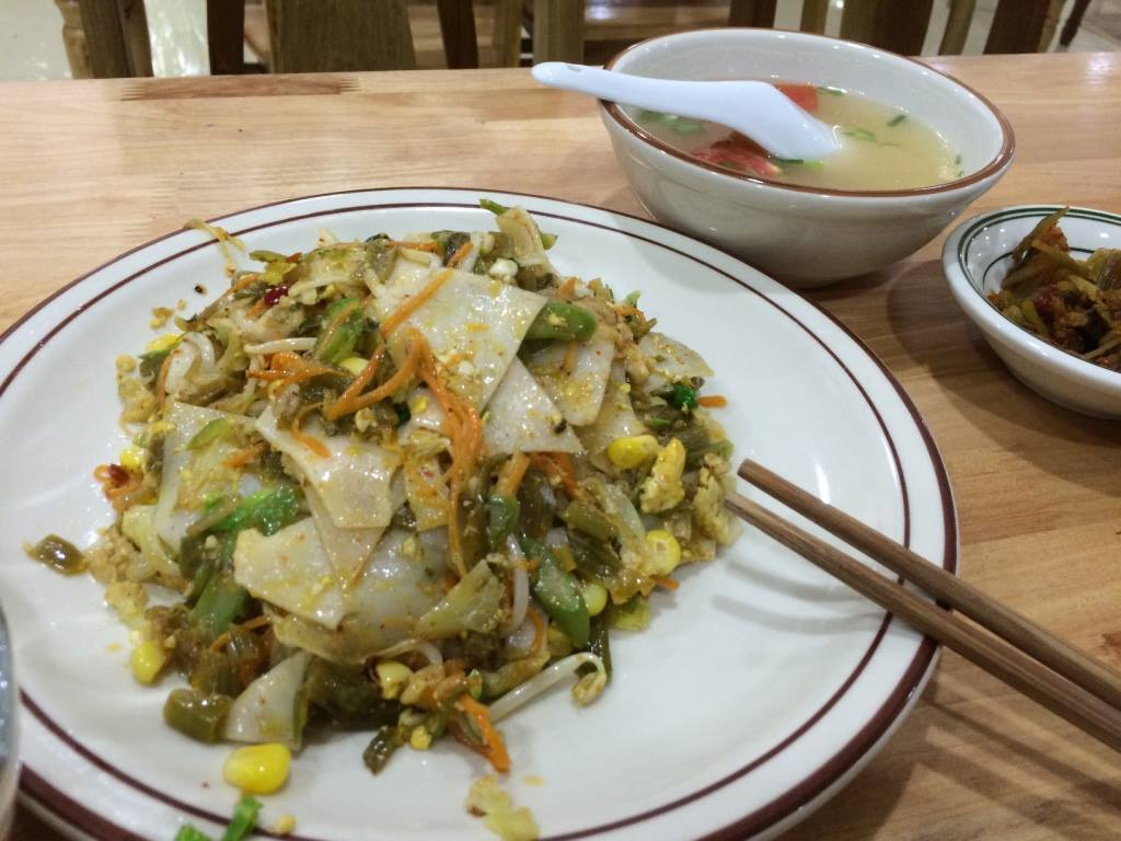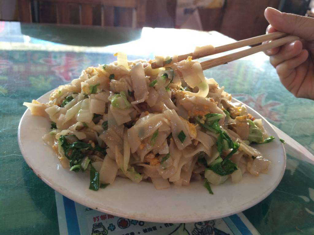 我中午沒吃,選擇點一盤炒卷粉!炒卷粉是瑞麗的特色小吃,深受當地人和遊客喜愛。卷粉的外型像細長的米粉捲,原料是用米漿蒸成薄片,再切成條狀。製作時會將卷粉加上雞蛋、豆芽、蔥花等配料一起熱炒,調味偏酸辣,帶有濃郁的雲南風味。炒卷粉口感滑嫩有嚼勁,酸辣開胃,還可以依個人口味加點花生碎或辣椒油,是瑞麗街頭最常見的地道小吃之一。