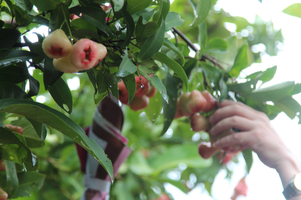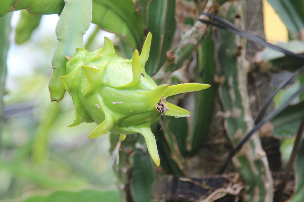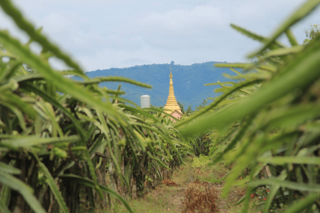 景區裡有一大片的火龍果園,前方可以看到緬甸或說傣族造型的建築尖塔。