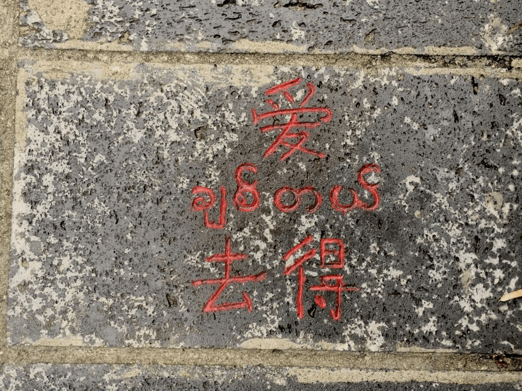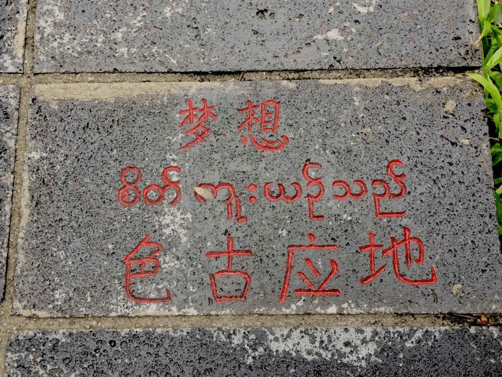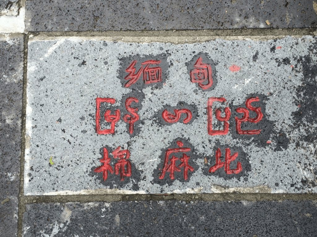 景區內的石板地上有一些緬甸文教學,並使用中文字大致標注了接近的緬甸文發音。