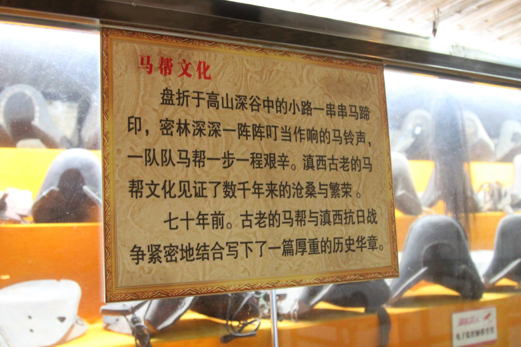 館內也有介紹雲南的「馬幫文化」,「馬幫」是由滇藏、滇緬等古老商貿路線上發展出的獨特文化現象。在交通不發達的年代,馬幫(以馬匹運輸貨物的商隊)成為連接中國與南亞、東南亞的重要運輸方式。商人們帶著茶葉、藥材、鹽巴、布匹等貨物,翻山越嶺,往來於雲南、西藏、緬甸、印度等地,形成著名的「茶馬古道」。