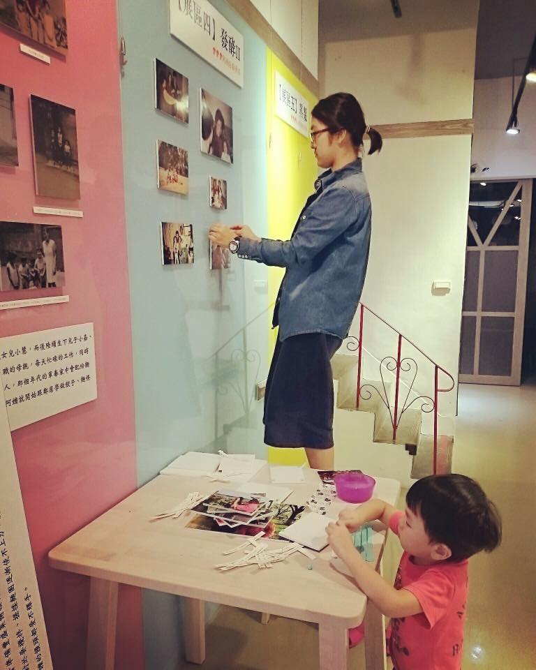 這個展區搭配介紹的是阿嬤成為母親,生了三個孩子(我媽媽、舅舅和阿姨),其中有多張照片都是在他們以前居住的眷村拍攝,大概在我媽國中的時候眷村拆掉,阿公阿嬤帶著三個孩子搬到當時剛蓋好的國宅(阿公阿嬤至今仍居住在這房子)。