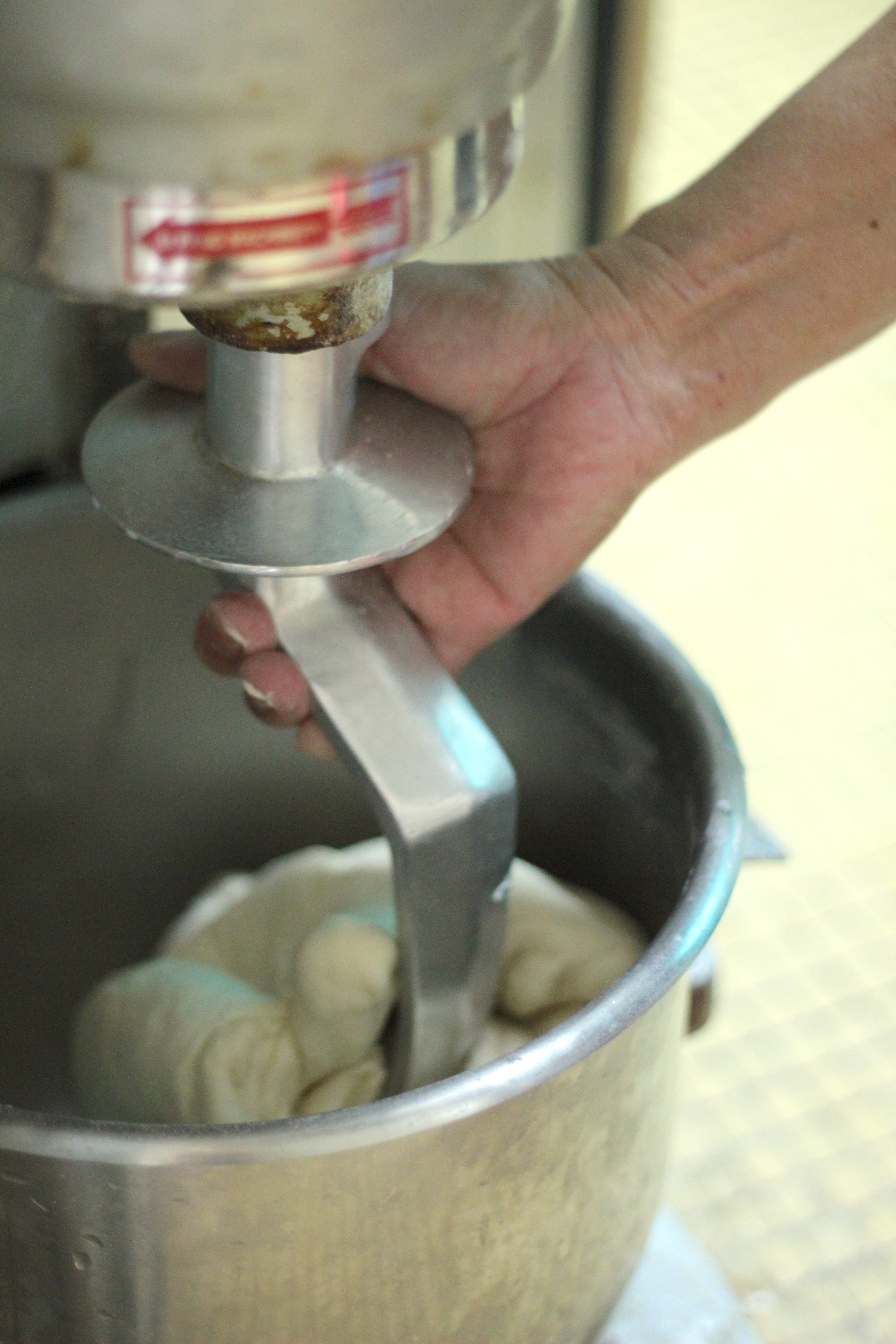 展區一是饅頭最開始的製作階段「混合成團、擀麵」,阿嬤早期做饅頭時,都是用手工自己和麵團,聽說經常揉到手非常酸,後來買了攪拌機之後,就輕鬆許多,幾分鐘就可以打完麵團。