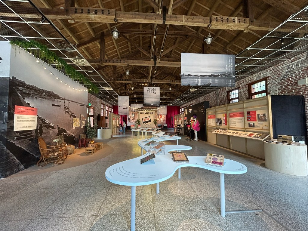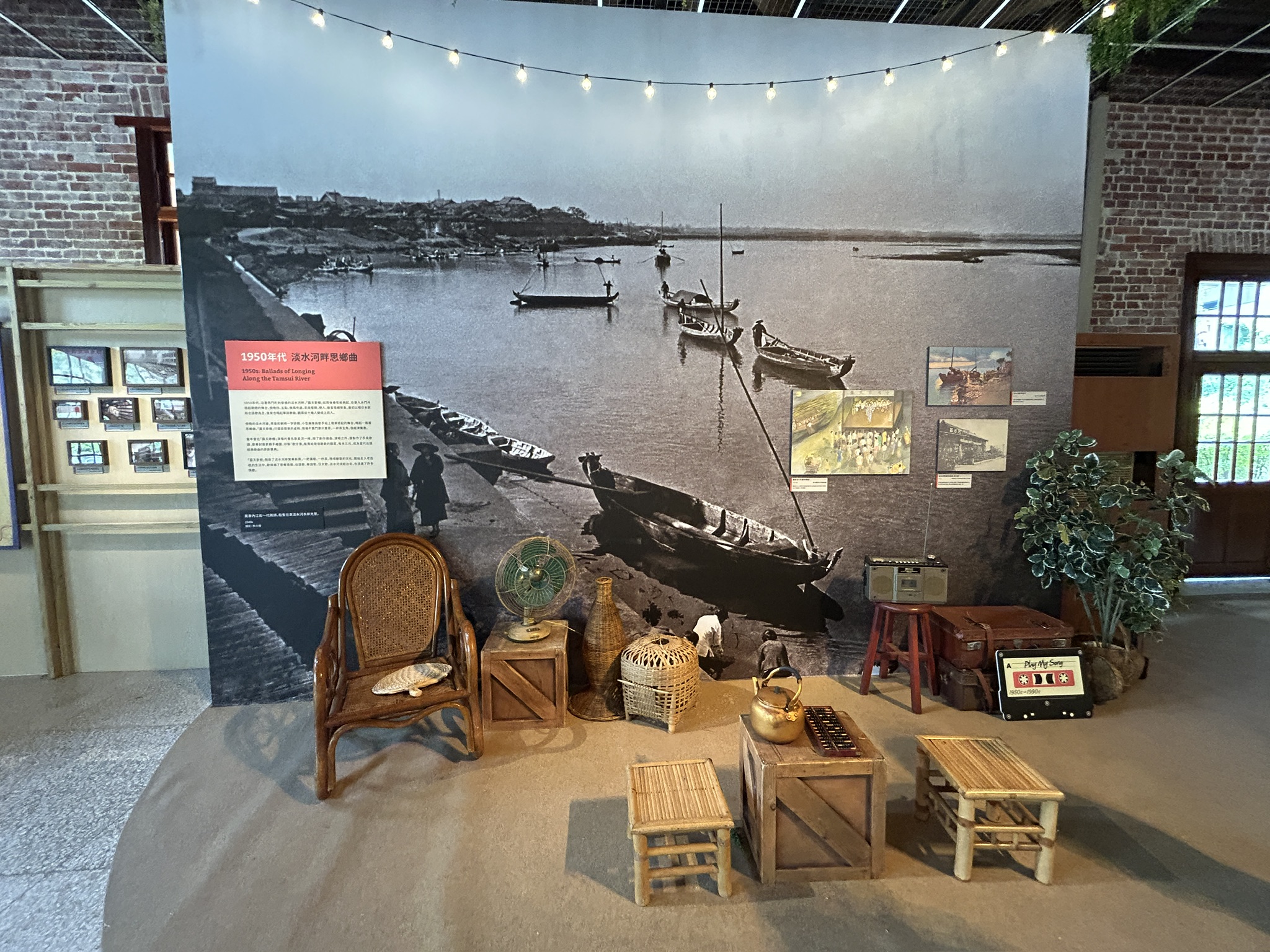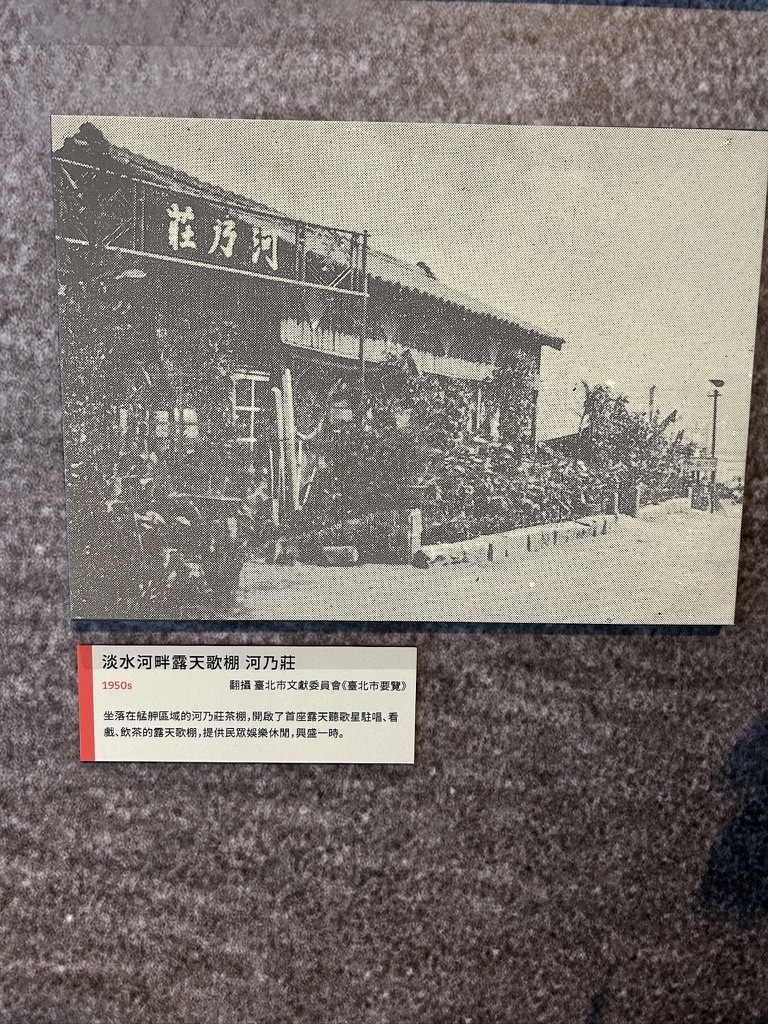展場一開始,就帶觀眾到淡水河畔的老歌棚時代,可以看到 1950 年代淡水河畔露天歌棚,是坐落在艋舺區域的河乃莊茶棚,開啟第一座露天聽歌星駐唱、看戲、飲茶的露天歌棚,提供民眾娛樂休閒,興盛一時。