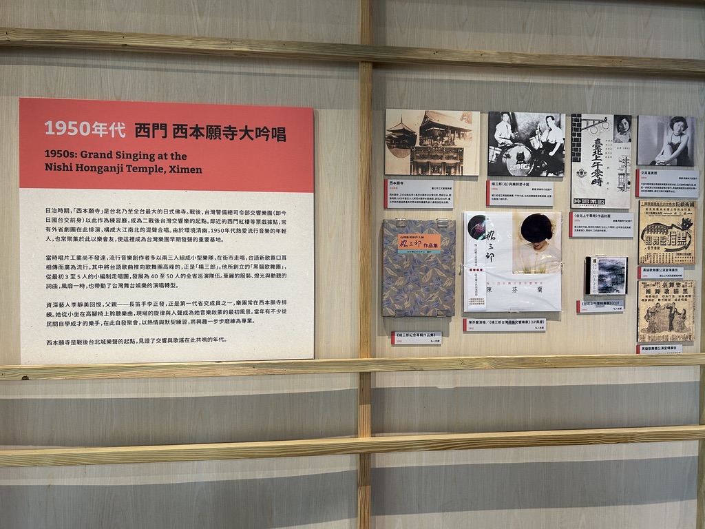走到展覽裡的「西本願寺」區,我才知道這裡不只是宗教場所,而是台北音樂史的一個起點。日治時期,西本願寺是全台最大的日式佛寺;戰後,成了台灣警備總司令部交響樂團的練習廳,也就是今天國立臺灣交響樂團的前身。鄰近的西門紅樓、票戲據點與外省劇團,讓這裡成了南腔北調的大合唱。