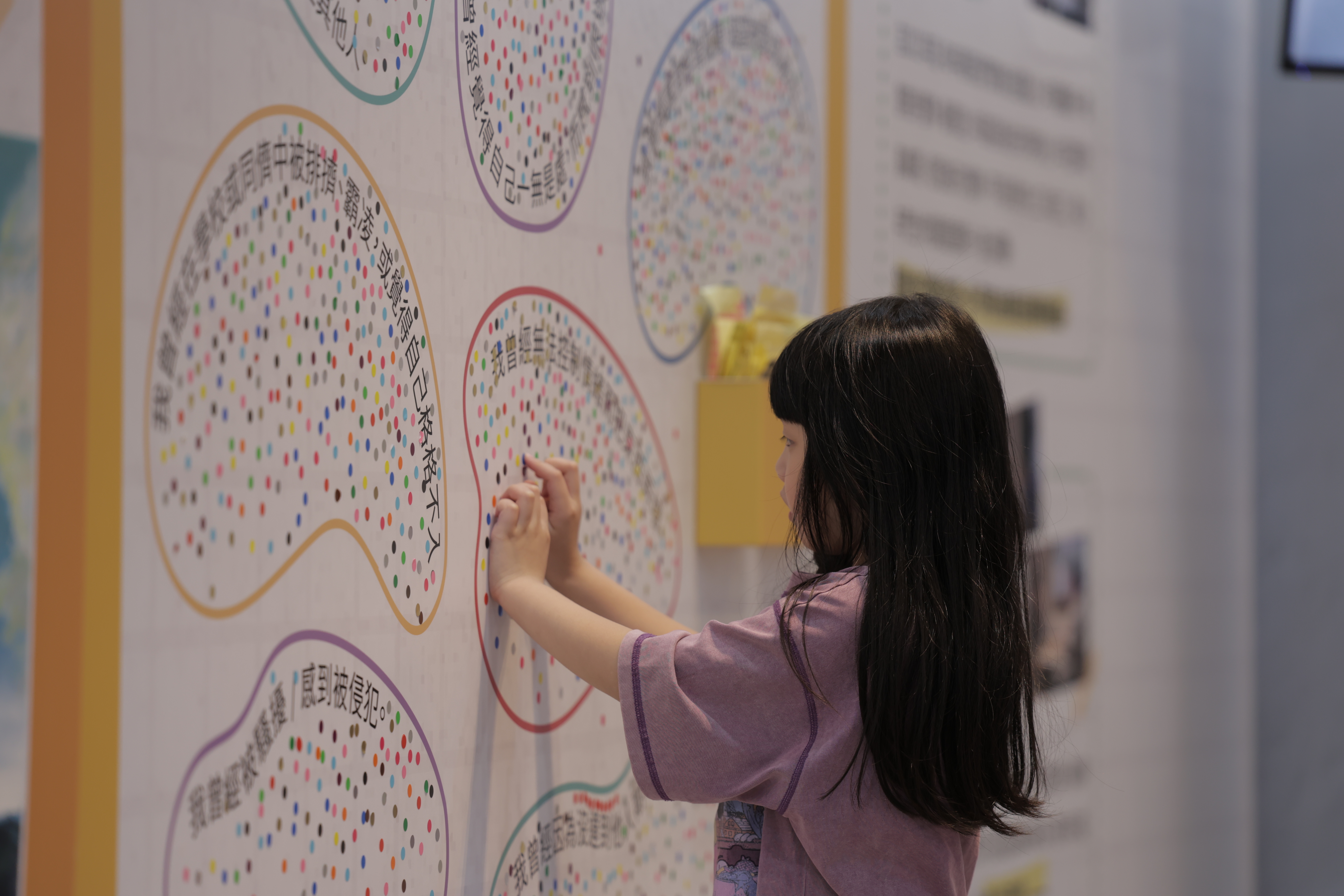 在這個互動區,我們邀請觀展者看看牆上的敘述,哪一句很像自己過往的經歷,就貼上一張點點貼紙。